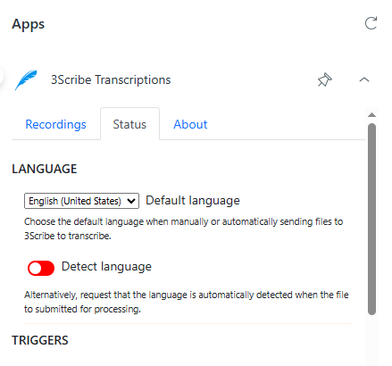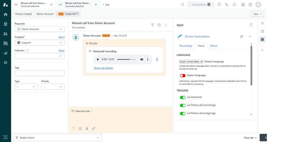 Once you install the 3Scribe Zendesk integration, you can configure how it works within your Zendesk account. This article explains how to configure 3Scribe Zendesk integration options, including selecting a default transcription language, enabling automatic language detection, and choosing which types of calls to transcribe. You manage these settings through the Status tab of the 3Scribe app in Zendesk.