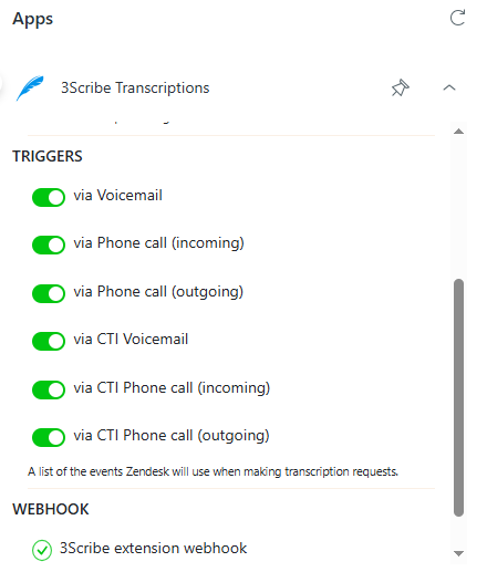 “Webhook, active 3Scribe extension webhook. The extension webhook tells Zendesk the web address to send transcription requests to.”